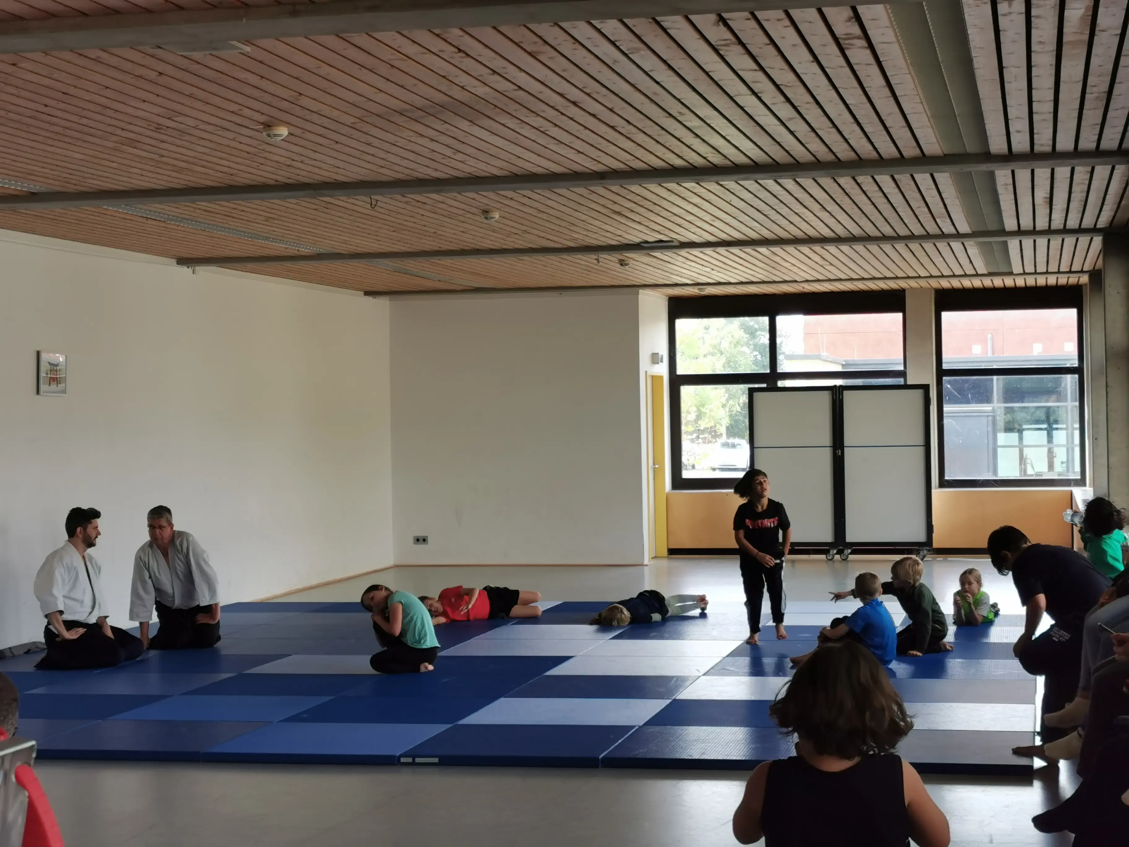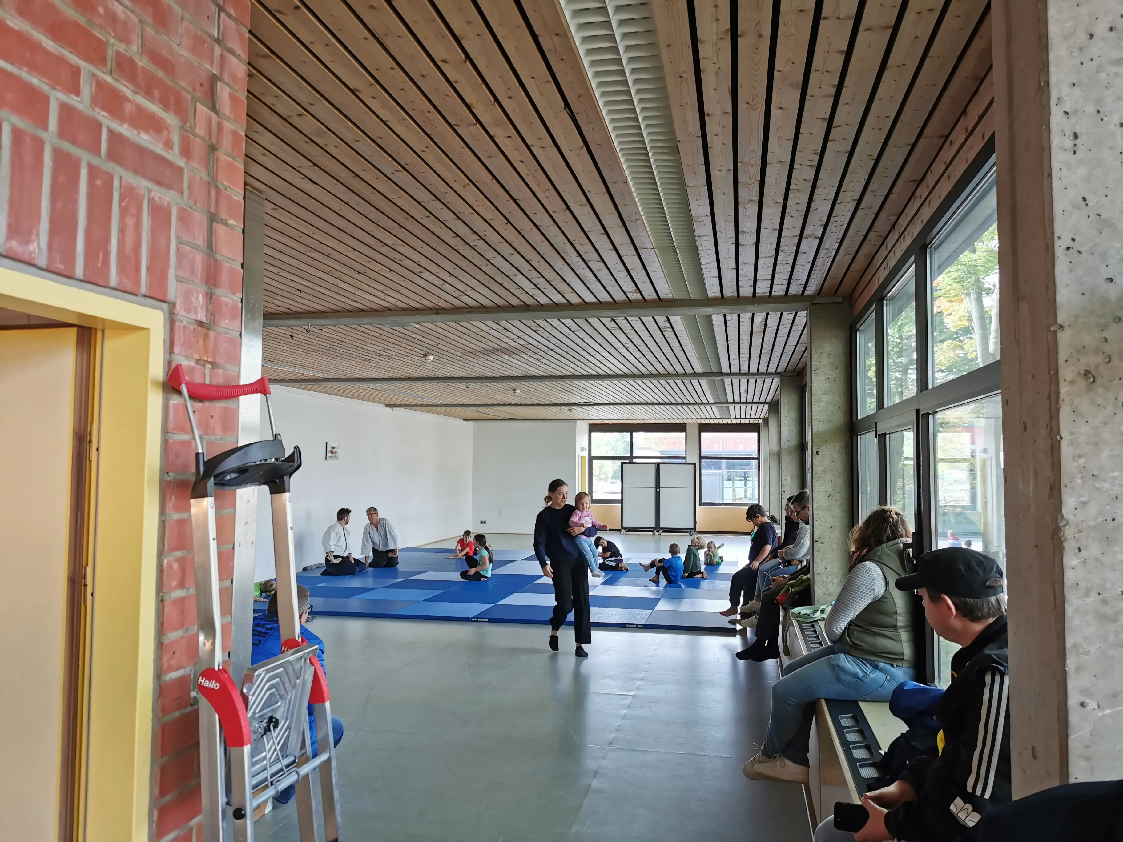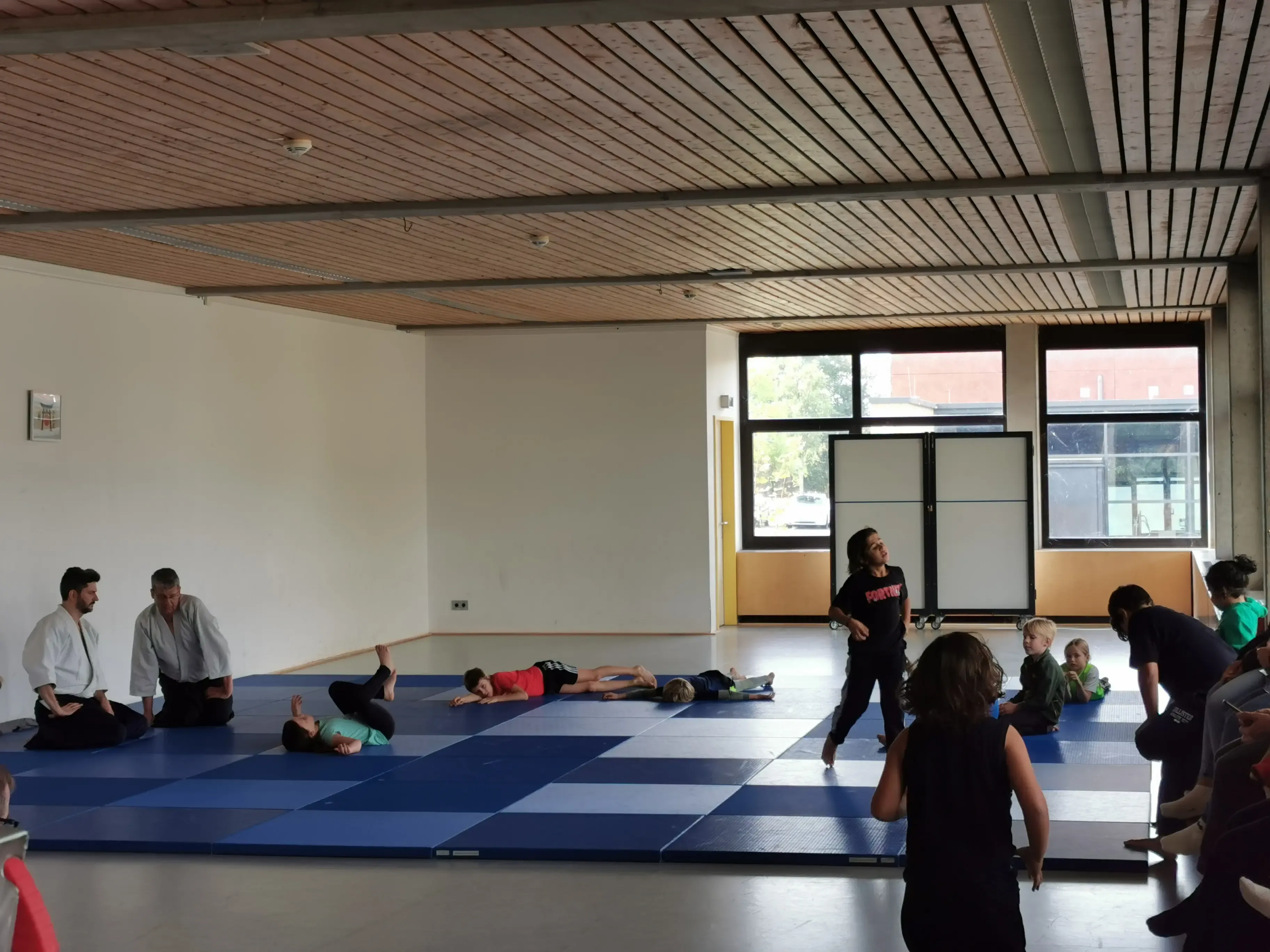 Rund um einen Wettkampf im Schwimmen, Laufen, Bogen- und Laserschießen, für den sich 28 mutige Teilnehmer/*innen fanden, wurden noch zusätzliche Sportmöglichkeiten geboten. Neben Workshops in den Sportarten Sportklettern und Aikido wurde das klassische Torwandschießen und eine kostenlose Hüpfburg für die Kleinsten angeboten.